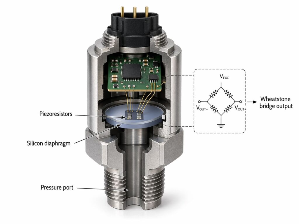 What you measure: bridge output voltage (often mV/V) proportional to pressure.