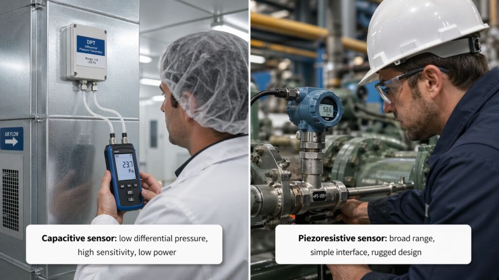 - Very low differential pressure (Pa to low kPa): capacitive often shines (sensitivity).