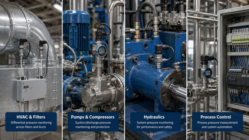| Application | Typical pressure type | Common range | Often favors | Why |